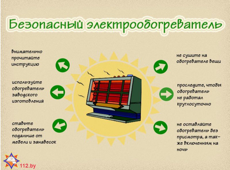 • Помните, что обогреватели – прежде всего электрические приборы. Поэтому не оставляйте их включенными без присмотра. Ни в коем случае не оставляйте включенным обогреватель на ночь. Не сушите на обогревателях вещи.