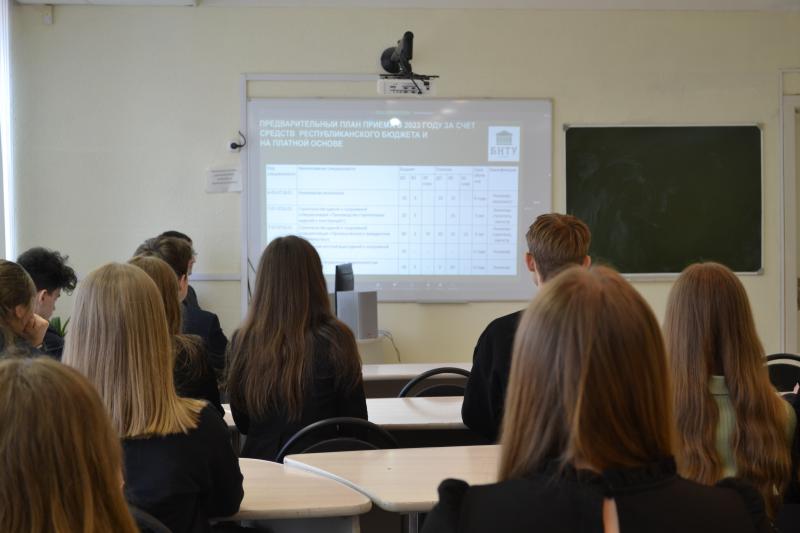 Преподаватели университета рассказали учащимся про специальности, по которым будет набор абитуриентов в 2023 году, довели до учащихся показатели конкурса на место, рассказали, какие документы нужно подавать для поступления и какие экзамены нужно сдавать.