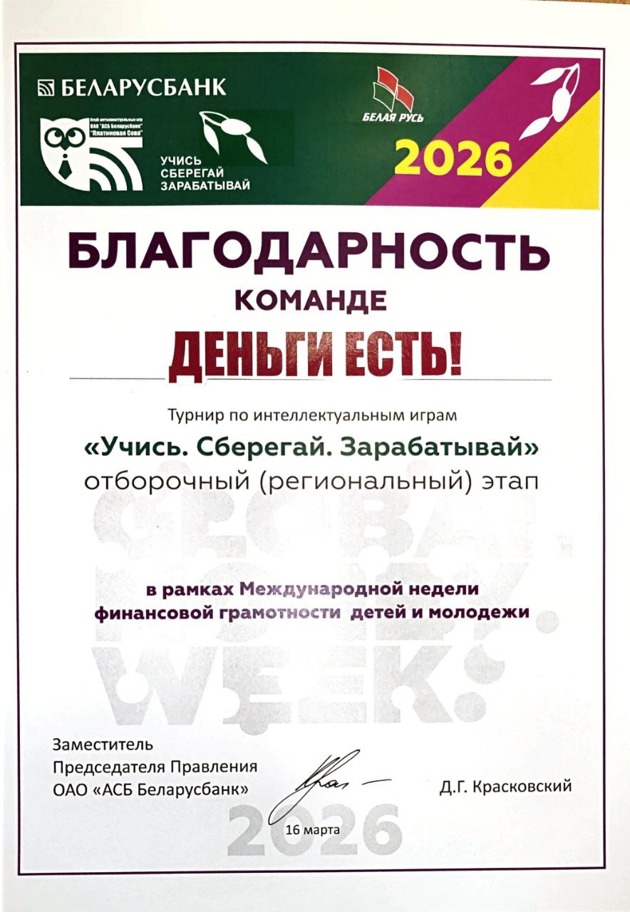 В рамках Международной недели финансовой грамотности детей и молодежи наши гимназисты приняли участие в интеллектуальном турнире «Учись.Сберегай.Зарабатывай», организованном Беларусбанком при поддержке РОО «Белая Русь».