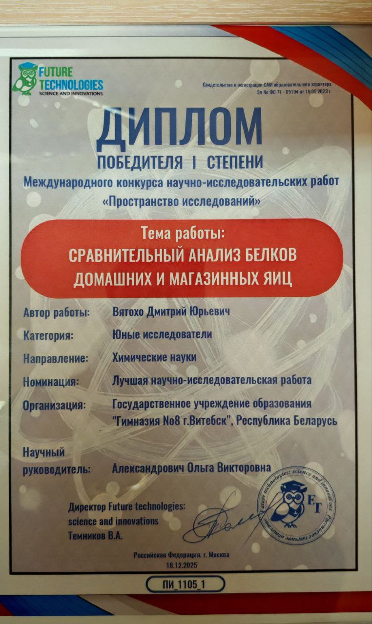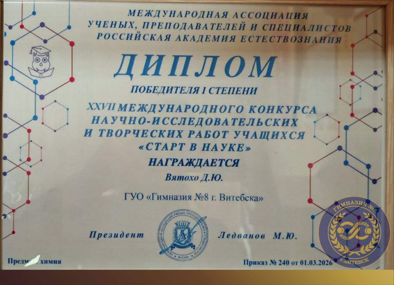 Учащийся 4 «Д» класса Вятохо Дмитрий стал победителем международного конкурса научно-исследовательских работ «Пространство исследований» и завоевал Диплом I степени! 🌟