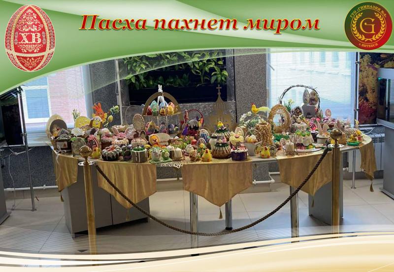 В ГУО «Гимназия № 8 г. Витебска в предпасхальную неделю ежегодно проходит традиционная выставка «Пасха пахнет миром». На этой выставке представлены декоративные яйца, расписные куриные, шоколадные, сделанные из бисера и других материалов; традиционные пасхальные куличи и пряники, а также пасхальные атрибуты в современной интерпретации (например, в виде цыплят, курочек и т.п.). В этом году новинкой стало традиционное праздничное литовское блюдо из яичного теста – шакотис, которое занесено в литовский национальный фонд кулинарного наследия. Авторы всех этих кулинарных и некулинарных пасхальных символов – учащиеся гимназии и их родители. Участвуют в выставке и педагоги, увлекающиеся кулинарным искусством. Выставка пользуется невероятной популярностью и каждый год вызывает неизменный восторг, так как символизирует не только благоденствие и процветание, но и великую силу таланта, творческого огня окружающих нас людей.